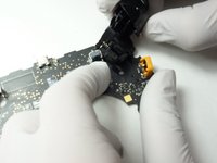 Use a Torx T5 screwdriver to remove the two 5 mm screws securing the motherboard.