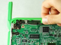 Remove the green side panel by pressing down on the small green button on the top and sliding the panel up.