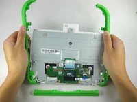 Remove the four 4mm Phillips #1 screws attaching the green trim to the body of the computer.