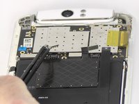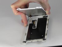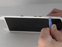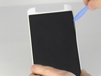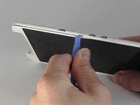 Insert the blue opening tool in between the black screen and the white border and slide it around the edge of the black screen.