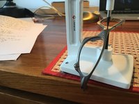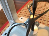 Fasten the Penny frame in the bench vice again. Reinsert the spring hinge, if it came out. Push the ear stem against the spring hinge (hard!) until the holes of ear stem and frame align. Put the Torx screw back in.