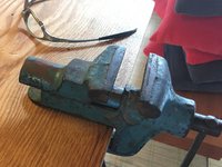 Clamp an orbital into the bench vice. The last picture is not showing the optimal position (refer to next step for that): the orbital screw should have been reinserted (not shown here) and the frame should be low in the bench and close to the hinge, so you can push against it without causing too much torsion on the frame.