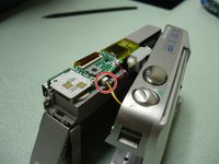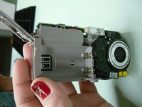 Locate and remove the two screws attaching the battery compartment cover to the rest of the camera.