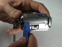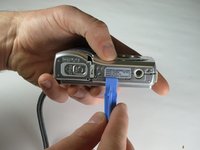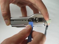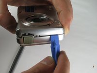 Loosen the panels on the sides of the camera in the shown places by slipping the plastic opening tool in the crack between the panels. Lightly apply pressure.