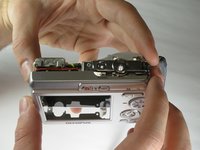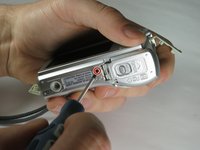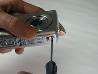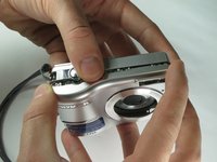 Remove the 2 exposed screws on opposite sides of the camera. Turn the screws counter-clockwise to remove.