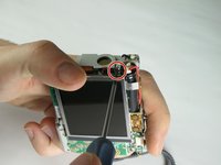 Carefully slip the head of the plastic opening tool under the panels by finding the crack between the panels. Lightly apply pressure in the shown places at the top and bottom of the camera.