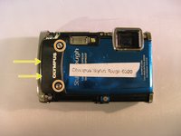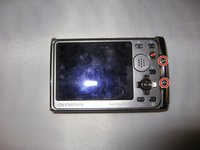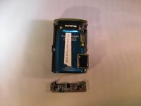 Using a Phillips 00 screwdriver, unscrew the 3.9mm screw located next to the black "Olympus" face plate.