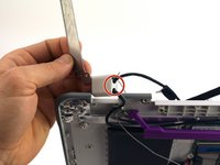 Use a spudger to pop out a white plastic cable retaining bit from the hinge body.