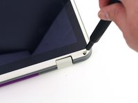 Using the iFixit plastic opening tool or spudger, start near the white hinge of the device and lift along the outer edges of the device until all clips are released.