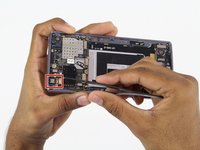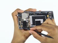 Once the battery is loose from the adhesive holding it down, use the spudger tool to pry up the connection from the battery to the phone on the top right hand side.