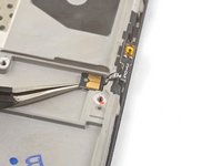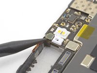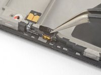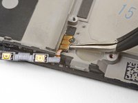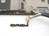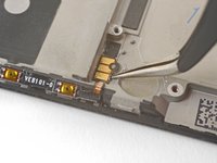 Squeeze the tweezer tips together and insert the point underneath the volume button board's contact pad near the top right edge of the frame.
