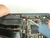After removal of the ribbons, there is one final screw. Once you have removed this, the motherboard easily pries out with spudger.