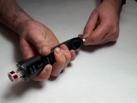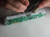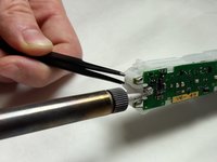 Use a soldering iron to melt the solder pad at the top of the motherboard, which attaches a battery electrode to the board. Remove the electrode by pulling it through the plastic housing after it has been desoldered from the board.