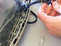 Unscrew the two 1.5cm Phillips-head screws at the back of the toaster that are holding the power cord in place to remove the retaining clip.