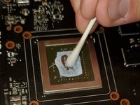 Wipe the top of the graphics chip gently with 91% isopropyl alcohol to remove the old thermal paste, avoid being too rough to prevent scratching the chip.