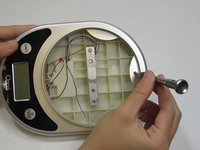 Lift up the sticker at the bottom where the “Ozeri” logo is to reveal a screw.