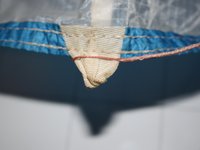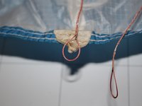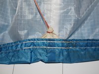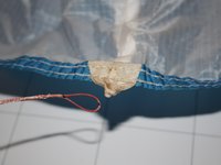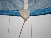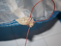 Following the - now red - brake line further up to the glider we will soon reach the first of the three cascades which need to be opened to replace a brake line of the upper cascade.