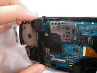 Being careful not to break the ribbon cable, use the spudger to peel the adhesive button of the the 'L' trigger off the PSP.