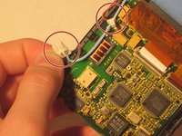 • Located near the bottom of the motherboard will be two ZIF connector tabs. Gently lift up the flap that secures these tabs and remove the tabs.