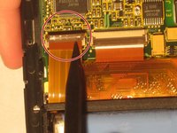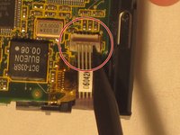• On the back of the motherboard near the top, gently lift up the flap that holds the ZIF connector tab in place. This will allow you to pull out the ZIF connector tab.
