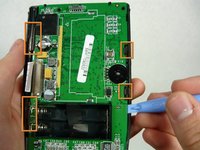Take the plastic opening tool and gently pry the circuit board out of the plastic tabs around the perimeter located as shown.