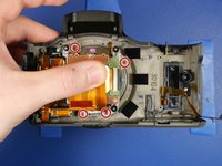 Since the camera is powered off and the battery is removed, the electronically controlled pop-up flash is non-operational. Thus, continuing the repair a bit of a hassle as getting to the two screws is impossible.