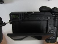 Rotate the top of the screen away from the camera body to access and remove the 4.5mm black Phillips #0 screw.