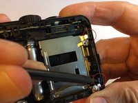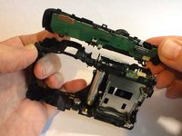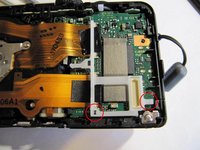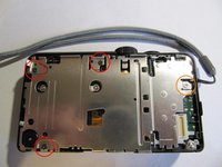 Remove 2 screws on the bottom of the case, adjacent to the tripod mount. Note that these screws are slightly shorter than the previous ones and so should be kept separate.