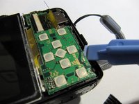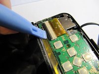 Lift the buttons board by inserting a spudger under the bottom right hand edge. This will detach it from a connector beneath.