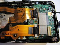 Gently peel off the black tape on the two ribbons running to the main logic board from the lens assembly.