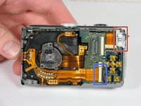 Use the spudger to remove the ribbon cable connecting the lens casing to the circuit board by lifting up the black clip.