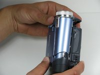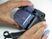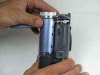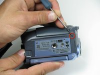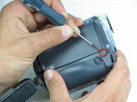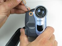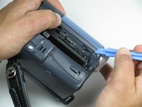 Use a plastic prying tool, remove the gray trim piece by opening and gently prying it off from top of the camcorder.