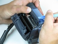 Place a plastic opening tool under the bottom of the blue panel beneath the camcorder.