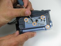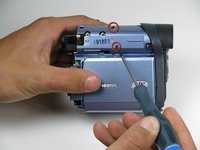 Flip over the camcorder and find the two 4.5mm screws, which are approximately 2 inches apart.