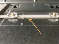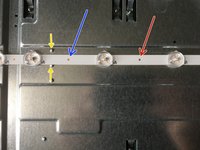 The early LED failure in this TV may have been due to the fact that one of the LED strips was not in the right place. There are guide pips (yellow arrows) showing where it should be positioned. Note the strip is on one of the pips so it can't sit flat on the metal chassis which also acts as a heat sink i.e. the adjacent LED's would run hot.