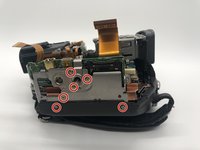 On the bottom side of the camera, remove six 5mm screws with your Phillips #0 screwdriver and the circuit board holder should be free.