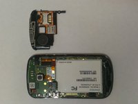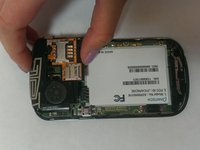 After taking out the screws, lift off the black plastic piece containing the speaker, Micro SD card slot and SIM card slot.