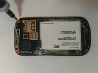After removal of front bezel and back cover, locate and remove two Phillips #000 screws from the top corners of the phone.