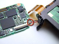 With tweezers, carefully detach the ribbon on the upper right corner of the internals that is connected to the shutter release/power button.