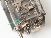 To test the actuation of the mirror and shutter, wind the camera, then insert a tool into this slot and push the release lever to the left.