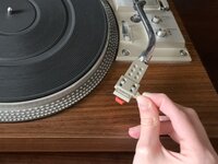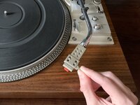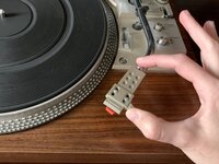 Grab your replacement cartridge. Hold the cartridge by the stylus and line up the prongs with the logo facing up. Then, gently push the cartridge into the joint.