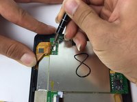 • Locate the orange connection strip that connects the motherboard to the display screen. Use your J001 to pry the connector off.
