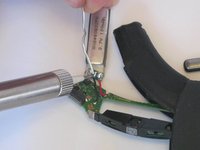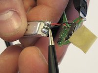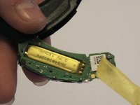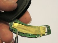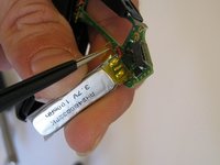Use precision tweezers to remove the transparent, amber tape that encloses the battery. This will reveal a smaller piece of transparent, amber tape that encloses the leads to the battery.