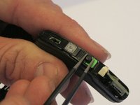 When lifted enough, use the pointed end of the spudger to lift the remaining distance. This is accomplished by inserting the pointed end of the spudger into the hole in the circuit board unit located at the opposite end of the charging port.