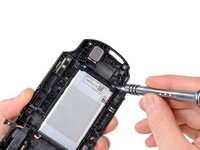 The battery is secured to the back case with a pair of Phillips #00 screws and... well that's it. There's no adhesive!