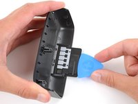Slide the tip of an opening pick under the right edge of the screw cover, near the flash.