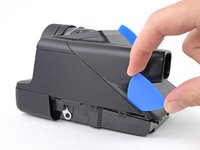 Slide the opening pick toward the rear of the camera to release the clips along the left edge.