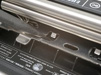 Two metal L-shaped rails at the bottom of the print roller need to slide under cutouts in the plastic housing.