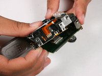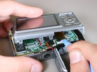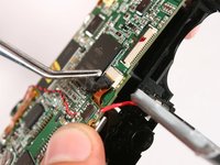 Using tweezers gently lift the black tab that holds the zoom lens ribbon in place.