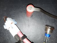 I spot welded a nickle strip to the minus end of the new battery. The new minus tab is aligned over the lengthwise Kapton strip.